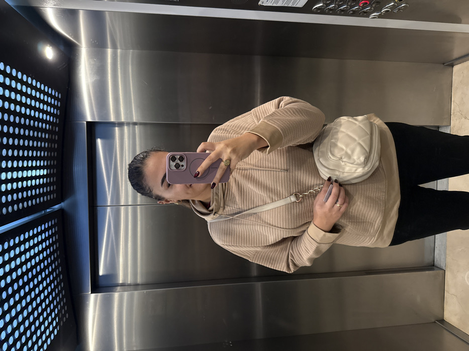 A woman takes a mirror selfie in an elevator. She holds a purple phone, showcasing dark manicured nails and a ring. She wears a tan hooded sweatshirt and black pants, accessorized with a quilted cream-colored crossbody bag. The elevator interior features a brushed metal wall, a panel with small circular lights, and a control panel. The floor appears to be marble or a similar material.