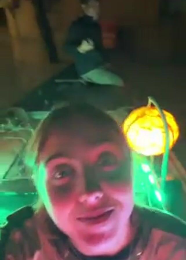 woman filming herself with her phone from a boat at night. Another man is in the back of the boat, facing away from the camera and toward the flooded street in front of them. The streets are flooded with water up to the headlights of vehicles, and houses are visible on either side of the street. The boat has a lit jack-o-lantern on the front of it. The woman looks at the camera and has a surprised expression on her face.