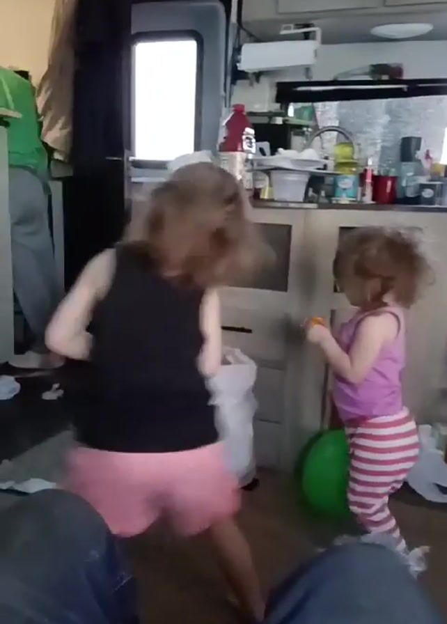 Two young girls are dancing around a trash bag inside a camper. One girl wears a black tank top and pink shorts. The other wears a pink tank top and striped pants. They are in front of the seated person, wearing blue jeans. The camper's interior includes cabinets, a window, and a door. A green balloon and other scattered items are also visible on the floor. The girl in the black tank top screams.