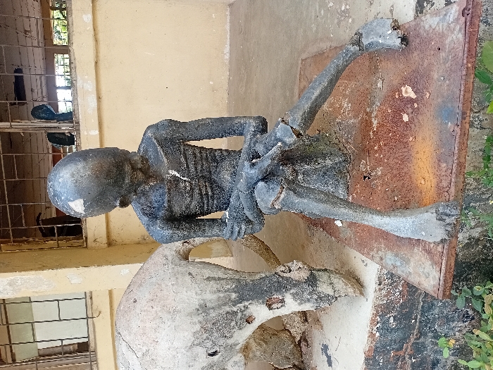 The image depicts two weathered sculptures situated outdoors on a concrete surface in Lokoja, Nigeria. **Subjects/Objects:** 1. **Human Figure Sculpture:** A dark-colored, emaciated sculpture of a human, seated with its head slightly bowed. The figure exhibits prominent ribs, thin limbs, and what appears to be clasped hands resting on its lap. The surface is rough, showing areas of damage and discoloration, including lighter patches and what may be exposed underlying material. It is anchored to a rectangular, rusted metal platform. 2. **Animal Figure Sculpture:** Partially visible behind and to the left of the human figure is a lighter-colored, fragmented sculpture of an animal, resembling the hindquarters and torso of a bovine or equine. Its head appears directed downwards, suggesting a grazing posture. This sculpture also displays significant weathering, cracks, and dark discoloration in various areas. **Environment:** * **Ground:** Both sculptures rest on a grey concrete pavement. The human figure is on a separate, rusted metal platform. * **Background:** A light-beige or cream-colored building with multiple rectangular windows is visible. The windows are fitted with dark metal grilles and show interior reflections or obscured objects. The building's walls appear aged and somewhat discolored. * **Foreground:** Sparse green vegetation, consisting of small plants or weeds, is present at the base of the rusted metal platform. **Condition/Details:** Both sculptures exhibit considerable signs of deterioration, including surface abrasion, material loss, cracking, and widespread discoloration consistent with prolonged exposure to outdoor elements. The metal platform supporting the human figure is heavily oxidized with extensive rust. There are no living beings visible in the frame, and the scene is static.