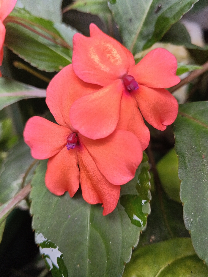 - "Two vibrant coral-colored flowers, likely impatiens, are centrally positioned, showcasing four petals each with a deep purple center" by FM-Bx5Pj2, licensed under CC BY 4.0