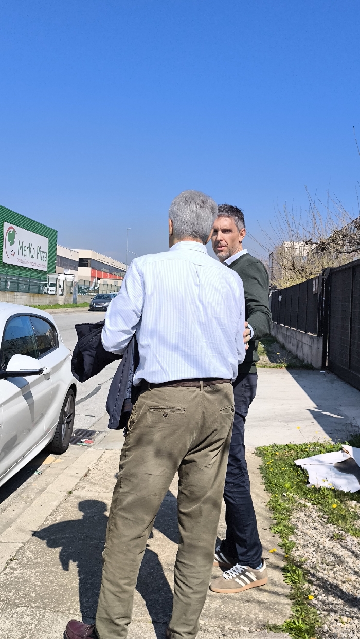 Two adult males are depicted conversing on a concrete sidewalk under a clear blue sky in an industrial area of Barberà del Vallès, Spain