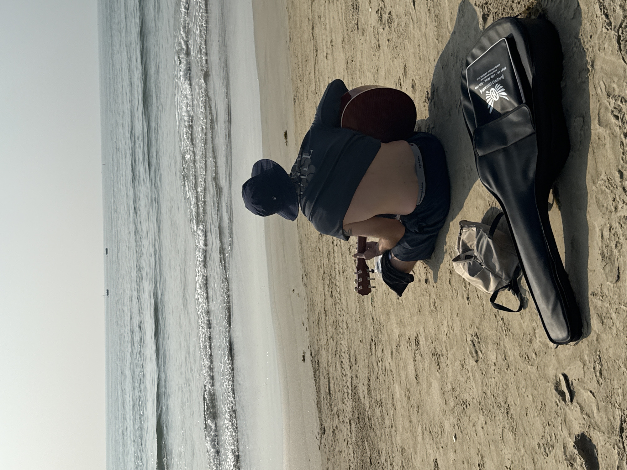 A man in a dark t-shirt, shorts, and a baseball cap sits on a sandy beach, tuning a guitar. Next to him is a black guitar case with a white logo on its pocket and a tan backpack. The ocean is visible in the background, with gentle waves lapping the shore. The location is likely My Khe Beach in Đà Nẵng, Vietnam, based on the beach's appearance and common activities.