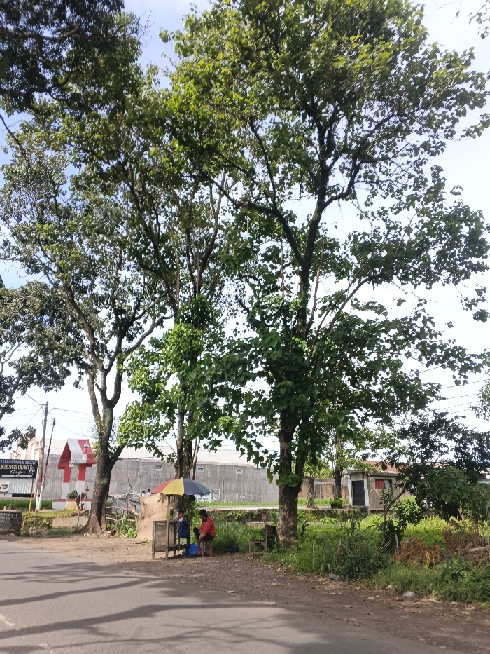 A road runs parallel to a line of trees. Two individuals are seated beneath a colorful umbrella next to a roadside stand. A grey building with red trim is visible in the background behind the trees. Overgrown vegetation fills the area beyond the stand and trees to the right. The sky is partially visible through the treetops.