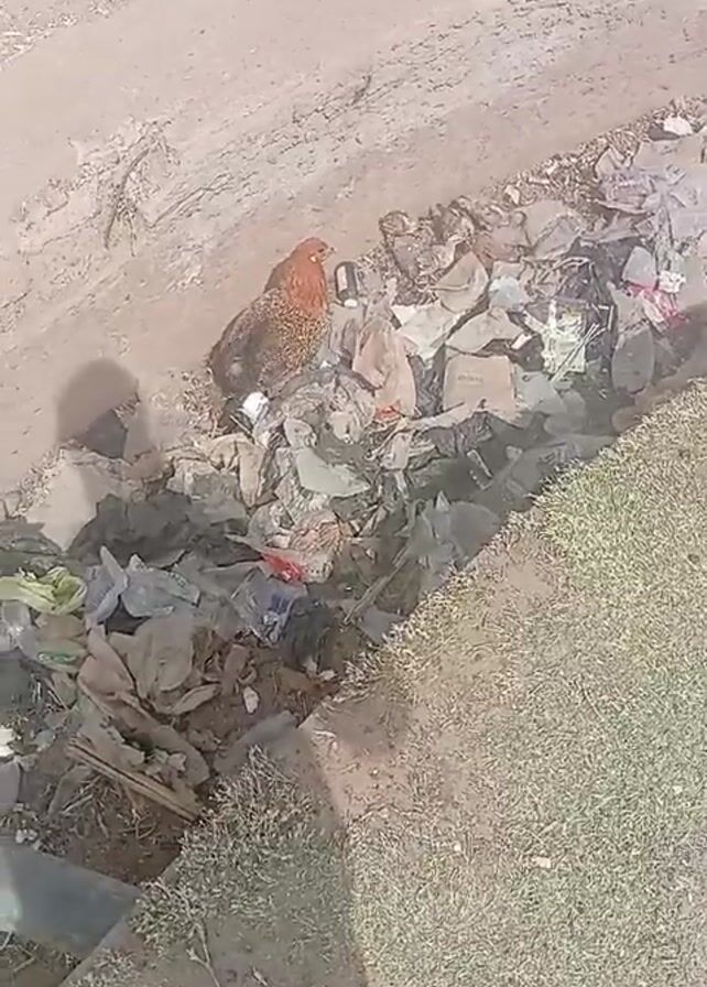 A chicken is foraging in a trash-filled drainage ditch. The ditch is lined by a dirt bank on one side and grass on the other.