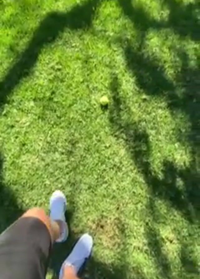 first-person perspective of someone walking on a grassy lawn towards a pool area. The person is wearing grey athletic shoes and black shorts. A tennis ball sits in the grass. The lawn is well-maintained with patches of sunlight and shadows cast by trees. In the background, there's a pool deck with lounge chairs. The day appears sunny.