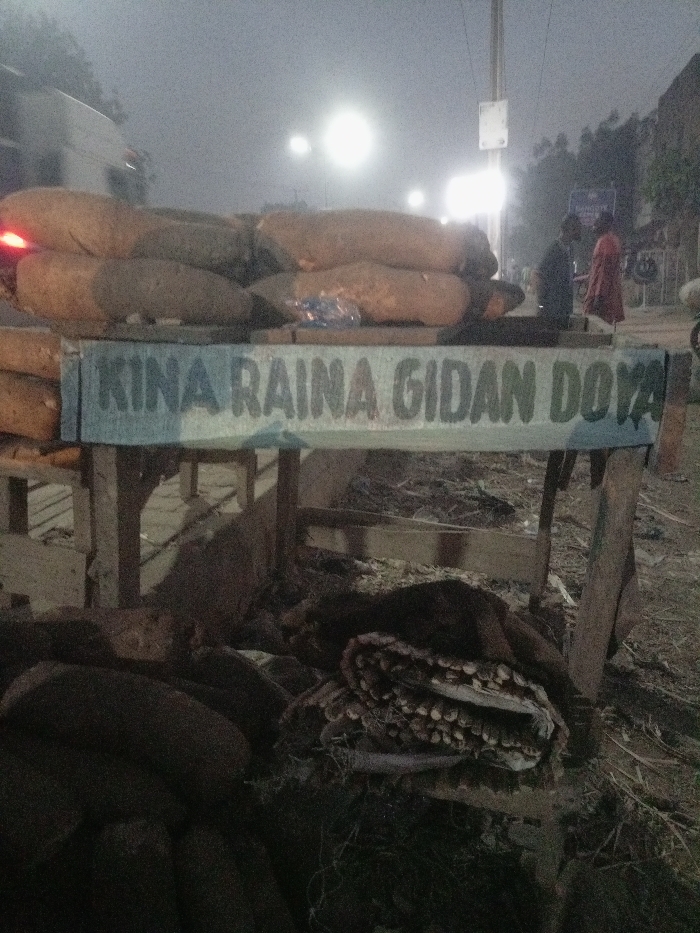 A wooden table piled high with yams under dim lighting. A sign reading "KINA RAINA GIDAN DOYA" is affixed to the table's front. A pile of what appears to be split yams or similar produce sits below. In the background, blurry figures of people are visible near the road, along with vehicles and lights. The overall scene is grainy and indistinct due to low light conditions.