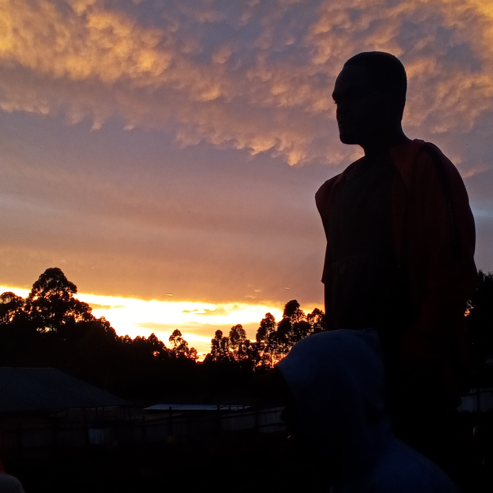 silhouette of a person in the foreground, positioned to the right of the frame, with their face turned towards the left. The person appears to be wearing a robe or shawl draped over their shoulders. Another person, partially obscured, is positioned slightly in front and below the first, wearing a hoodie. The background consists of a sunset with orange and purple hues in the sky. Below the sunset, there's a treeline of silhouetted trees. Further down, dark shapes suggest buildings and structures in the distance. The location is likely Borabu Chitago ward, Kenya, based on the prompt. The absence of specific architectural details or distinctive landmarks limits precise identification.