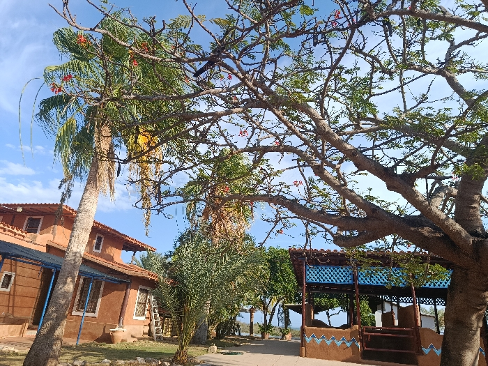 The image displays an outdoor scene in Guayacancito, Venezuela, under a bright blue sky with scattered cirrus clouds. A large, mature deciduous tree with extensive branching, sparse green foliage, and small red blossoms occupies the foreground and midground on the right. A tall palm tree with green fronds and several dried, hanging fronds is prominent on the left. In the midground, to the left, a two-story building constructed of reddish-brown stucco with a terracotta-tiled roof is visible. It features multiple rectangular windows with light-colored frames, and a blue awning extends from its lower facade. A silver-colored extension ladder leans against the right side of this building, near a large, light-colored planter pot. To the right, an open-air pavilion-style structure with reddish-brown walls is present, distinguished by a light blue and white zigzag pattern along its base and blue decorative fretwork beneath its tiled roof. Additional green vegetation, including smaller palms, is distributed throughout the landscape. In the far background, beyond the structures and trees, a tranquil body of water, indicative of a coastal or bay environment, is visible, meeting the horizon. No individuals are present, and no discernible actions or interactions are occurring.