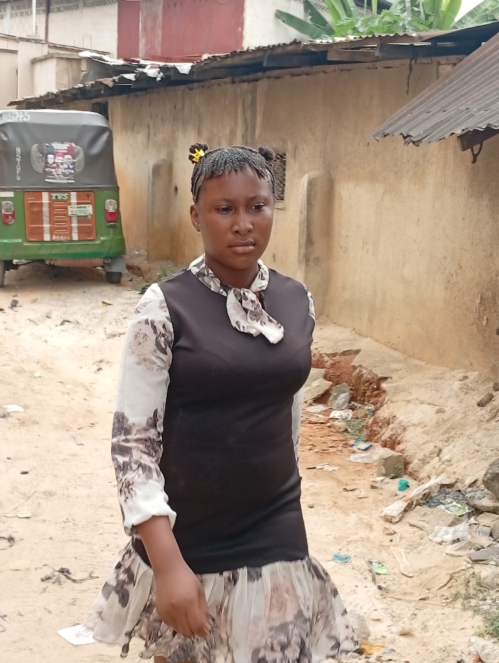 A young woman stands in an outdoor setting, wearing a black and floral dress. She has her hair styled in braids with yellow accessories. Behind her, there is a green vehicle, a beige wall with small windows, and some foliage overhead. The ground appears to be dirt and gravel, with some debris scattered around. The setting has a somewhat rustic and informal feel.