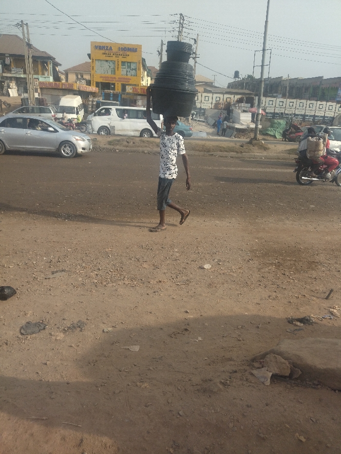A man in a white shirt with black patterns is walking down a dirt road. He is carrying a large, black, plastic container on his head. The road is in the middle of a town, and several buildings are in the background. There are several cars parked in the background, as well as some people walking. In the far right corner of the picture, a man on a motorbike is driving away from the camera. The scene is in Way, Nigeria, at coordinates (latitude: 9.029, longitude: 7.584).