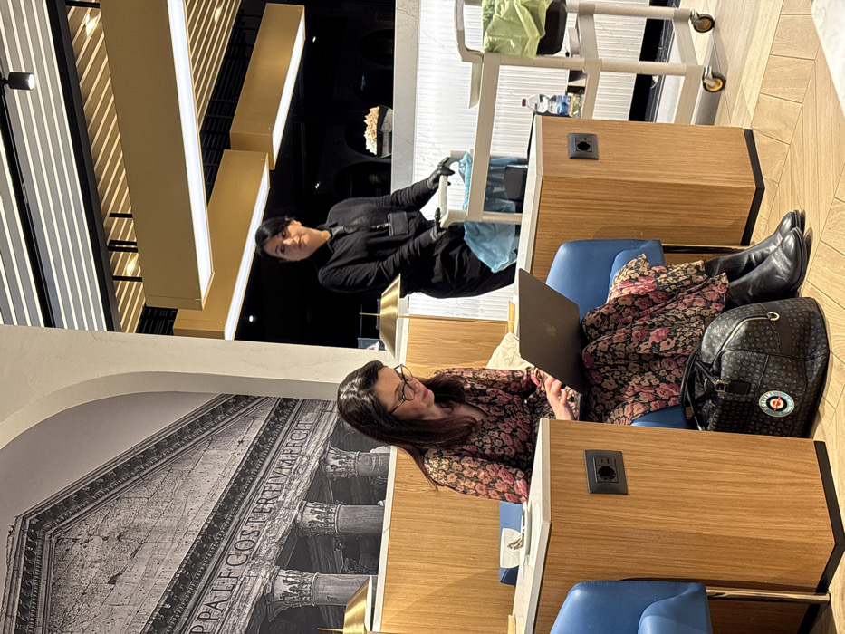 This image captures an indoor scene within a modern lounge area at Leonardo da Vinci International Airport (FCO) in Fiumicino, Italy