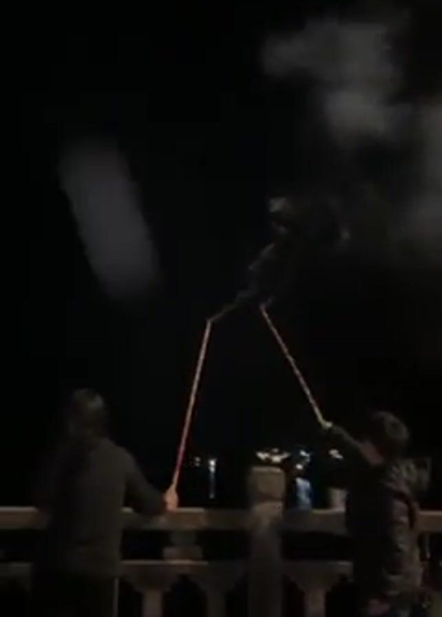Two people are standing on what looks like a stone bridge at night, holding rods with fireworks on the ends
