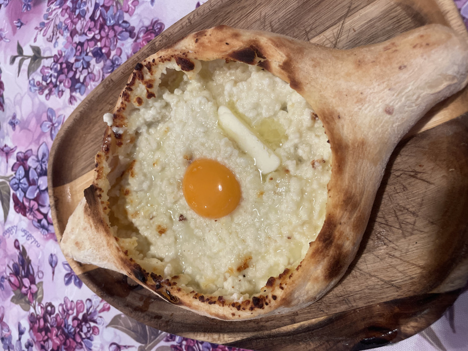 - "A boat-shaped Khachapuri Adjaruli is centrally positioned on a rustic, oval-shaped wooden serving board" by FM-oln9s2, licensed under CC BY 4.0