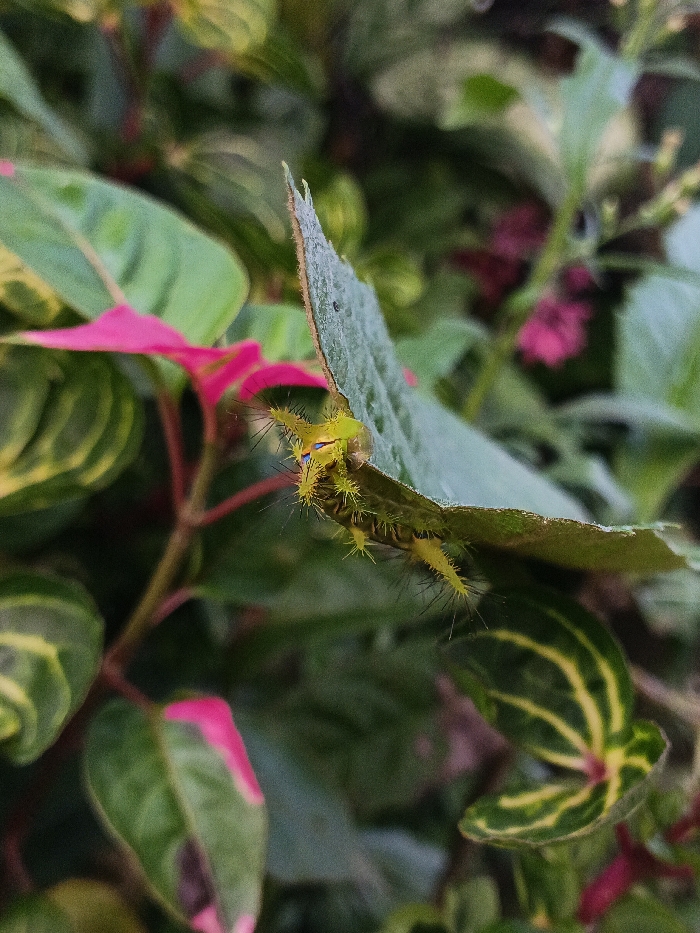 A close-up, high-angle shot depicts a bright green caterpillar positioned on the underside of a dark green leaf. The caterpillar possesses multiple yellow, spiky urticating hairs tipped with black, and features prominent blue markings on its head region. It is resting horizontally, partially obscured by the leaf's edge. The surrounding environment consists of a dense arrangement of various green plants and foliage, with several leaves exhibiting distinct coloration; one leaf in the middle ground displays a vibrant pink margin, while another in the lower right foreground presents a yellow and green striped pattern. The background is softly blurred, showing additional green and dark pink botanical elements. The scene is located in the city of Unknown, Cambodia.