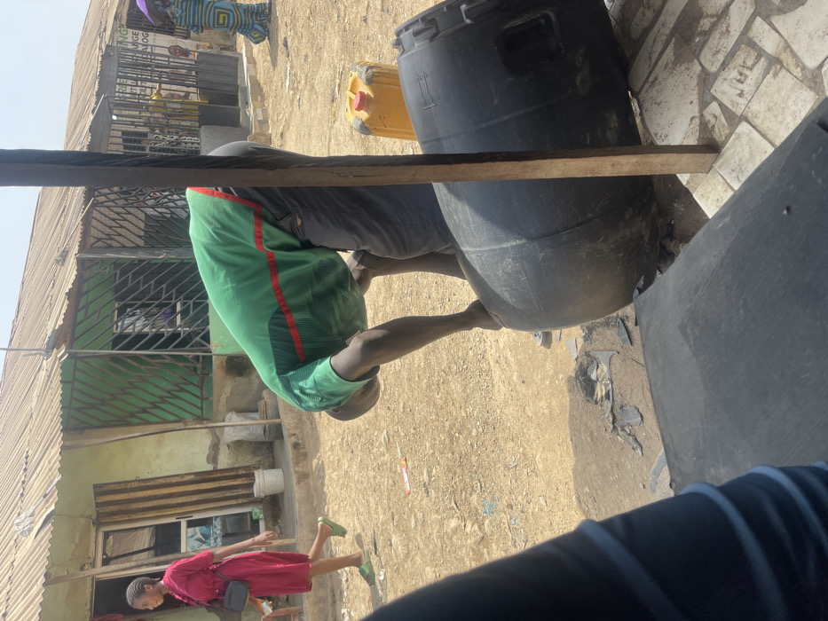 The image captures an outdoor scene in Dzhidu, Nigeria, under bright daylight. In the foreground-midground, a dark-skinned male, dressed in a green t-shirt with red and black patterns and dark grey trousers, is bent at the waist, hands positioned on the top rim of a large, black plastic barrel lying horizontally on the dirt ground. A yellow plastic jerrycan stands upright behind the man and the black barrel. The ground is uneven, light brown dirt, scattered with minor debris and a small patch of disturbed earth near the barrel. In the mid-ground to the left, a dark-skinned young woman wearing a short red dress, light green slides, and a black shoulder bag walks from left to right. In the background, a row of single-story buildings is visible, the closest featuring light green painted walls, corrugated metal roofs, and windows secured with green metal bars. To the far right in the background, another individual, partially obscured, is seen wearing a blue and white patterned garment and a purple head covering, walking away. A dark wooden post is vertically positioned in the mid-foreground, partially obscuring the view.