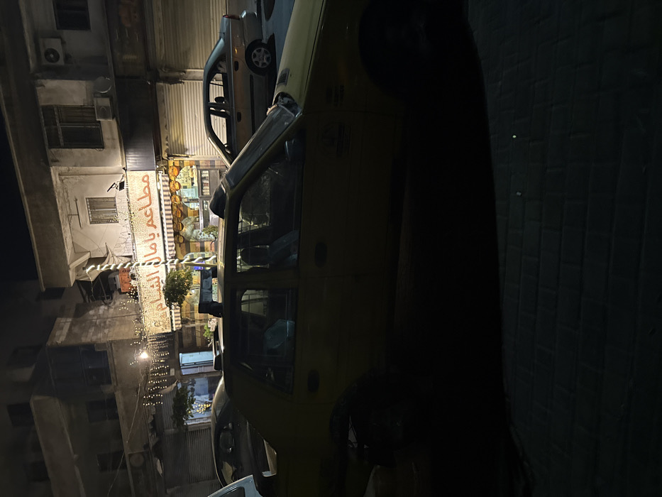 This image depicts a nighttime urban street scene within Barza Municipality, Syria. The foreground is dominated by a dark yellow four-door sedan, likely a taxi, parked on a paved surface with brick-like patterns. The vehicle's lower half is heavily shadowed. Two dark, aerodynamic attachments are visible on its roof. In the midground, behind the yellow vehicle, a silver or light gray sedan is also parked. The background features multi-story buildings housing commercial establishments at street level and residential units above. A prominent, brightly illuminated storefront is visible, displaying Arabic script on its sign that reads "مطاعم يا مال الشام" (Yamal Al Sham Restaurants). This establishment features a patterned awning and internal lighting that reveals interior counters. Decorative string lights are strung across the facade of the restaurant and extend towards adjacent buildings. A white, vertically lit pole stands near the restaurant entrance. Other storefronts nearby appear closed, indicated by metal shutters. Air conditioning units are mounted on the building exteriors. No individuals are discernible in the scene, and no active interactions or movements are observed. The environment suggests a commercial street after dark, illuminated by artificial light sources.