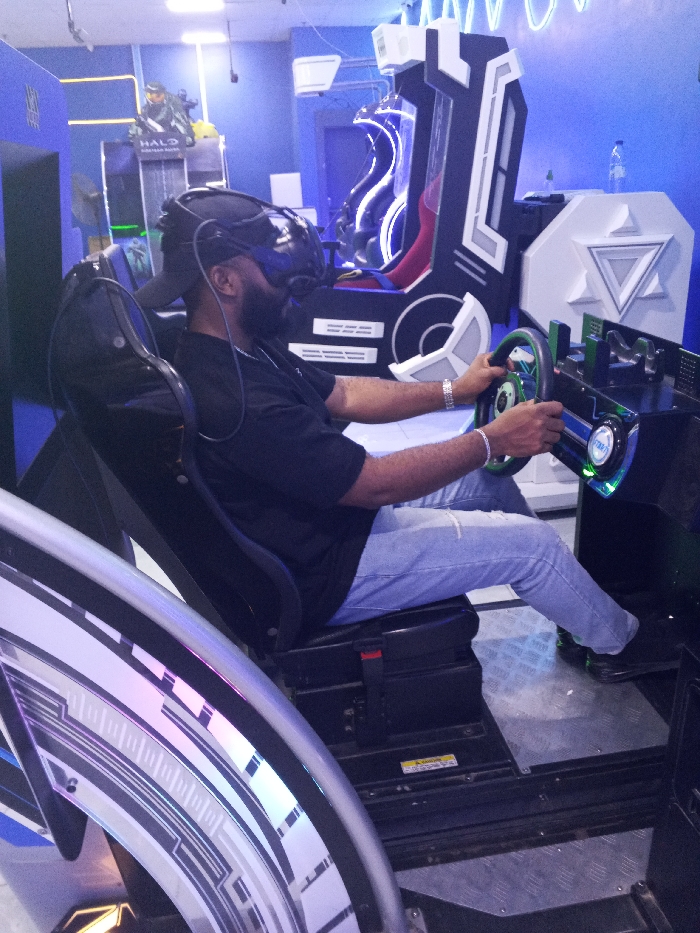 A person sits in a virtual reality driving simulator. They wear a VR headset and grasp a green steering wheel. The simulator has a black seat and a futuristic design with white and gray accents. In the background, there's a Halo-themed arcade game and neon lighting, suggesting an arcade or gaming center environment. The person is wearing a black t-shirt, light blue jeans, and black shoes.