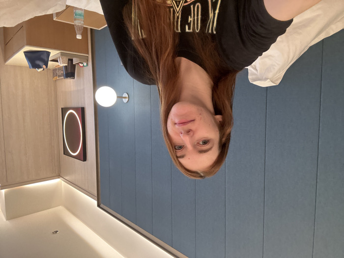 A selfie shows a fair-skinned woman with long, reddish-brown hair wearing a black t-shirt. She is positioned against a blue, textured wall. The background includes a modern hotel room with a nightstand featuring a water bottle and toiletries. An illuminated circular artwork hangs on a wood-paneled wall adjacent to a sphere-shaped wall light. Soft lighting illuminates the room. The perspective is slightly tilted.