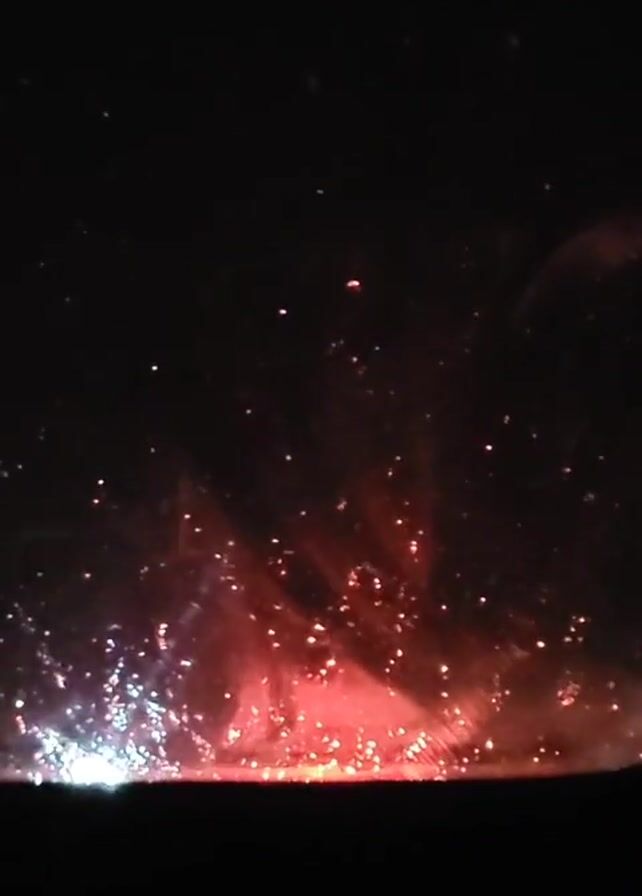 A video shows what appears to be a nighttime scene with a light effect, possibly fireworks or a light show, visible in the distance. The foreground is dark and undefined, likely obscuring a horizon line. The effect consists of red and white lights. The lights appear to be exploding or bursting outwards. The scene is dark overall.