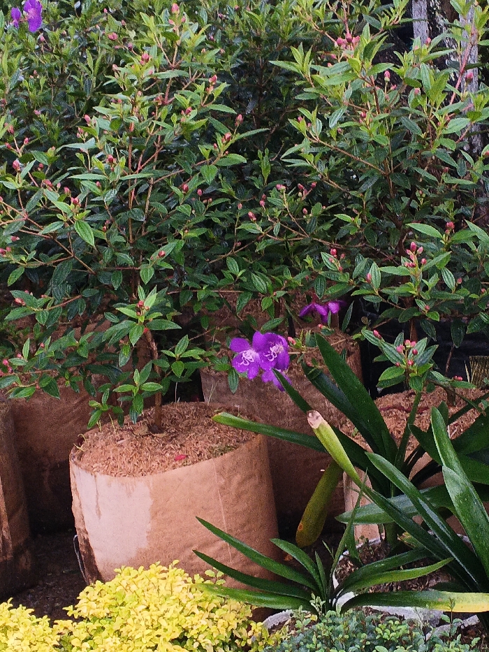 An outdoor scene in Lvea Aem District, Cambodia, displays a dense arrangement of cultivated plants. The foreground contains a cluster of small, bright yellow-leafed plants on the lower left, and dark green, strap-leaved plants on the lower right, one exhibiting a prominent pale green, cylindrical stalk. The midground and background feature numerous larger green shrubs with small, reddish-pink flower buds distributed among their leaves. Several of these shrubs are contained within light brown, possibly fabric, grow bags filled with light brown wood chip mulch. Distinct vibrant purple flowers, each with multiple white internal structures, are visible among the green foliage in the midground, with additional purple blooms partially obscured further back. No individuals or overt actions are observed.