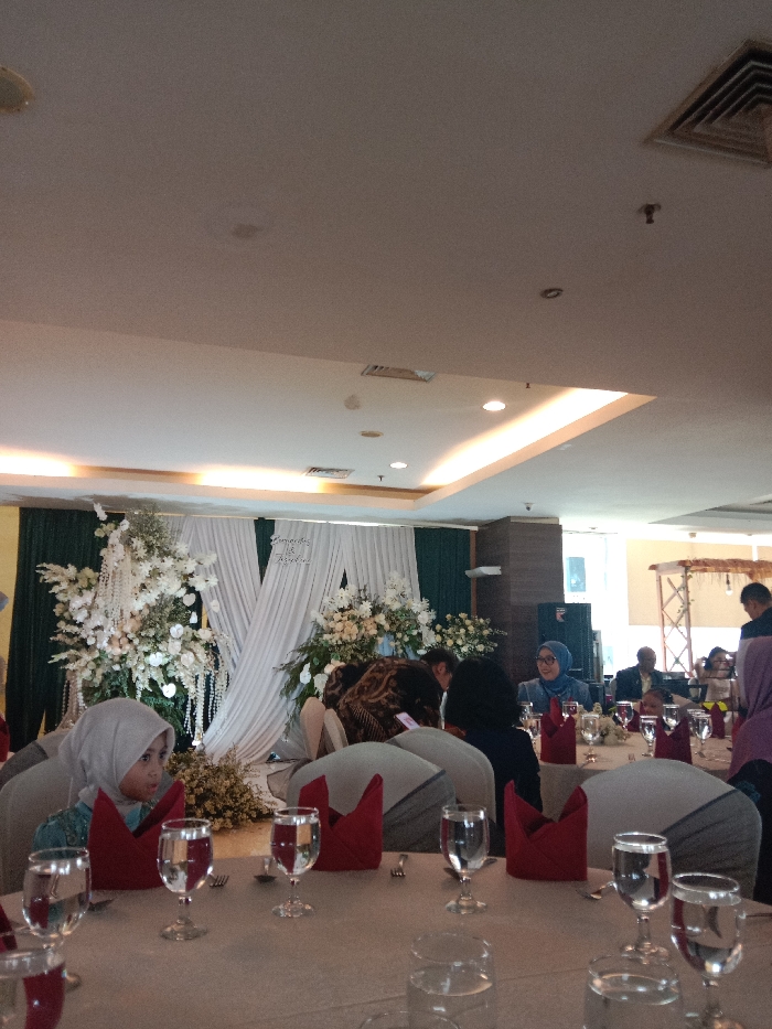 A banquet room is set for a wedding. White floral arrangements and draping decorate the stage. Round tables with white tablecloths are set with water glasses, silverware, and red folded napkins. Several guests, including a young girl in a hijab, are seated at the tables. Some guests are looking at phones. The ceiling features recessed lighting and ventilation grills.