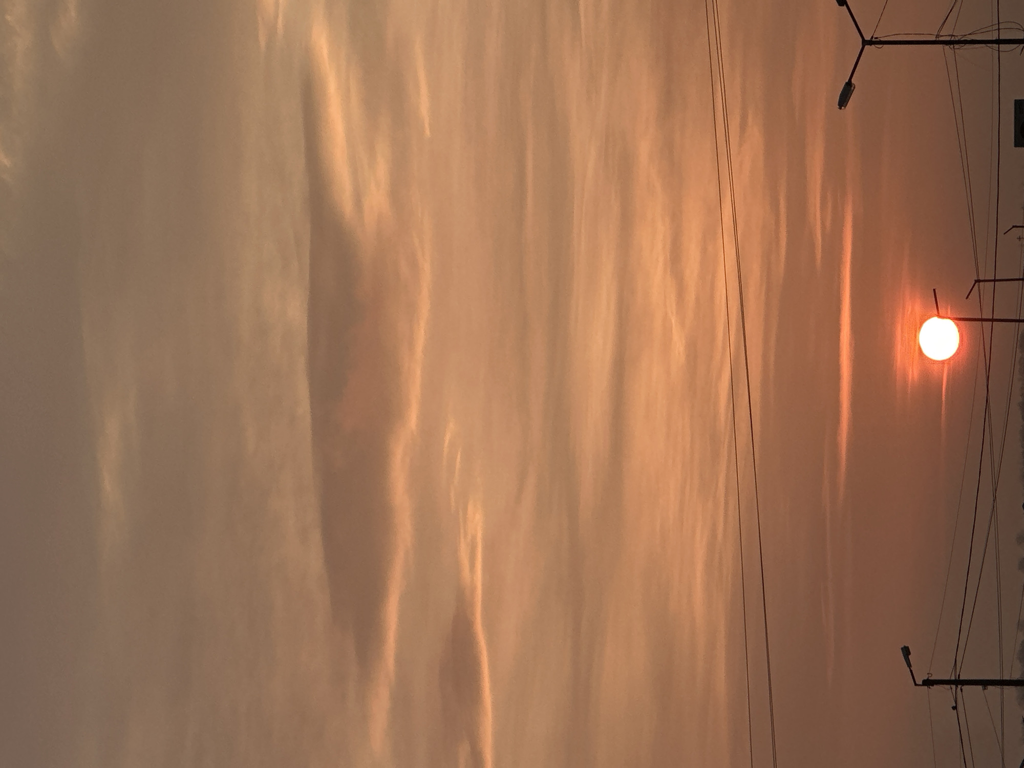 The image depicts a sunrise or sunset over an unidentifiable urban or semi-urban landscape, within the city of Unknown, Unknown. The sky is dominated by warm hues, transitioning from a bright orange and pink near the horizon to a muted brown-orange and grey-brown in the upper atmosphere. Wispy, elongated clouds are horizontally stratified across the entire sky. The sun, a brilliant, near-white circular disc, is positioned low on the horizon, slightly left of the image's vertical center. The foreground, comprising the lower third of the frame, features dark, indistinct silhouettes of multiple utility poles and streetlights, interconnected by numerous horizontal and diagonal power lines. No individuals or discernible actions are present within the scene.