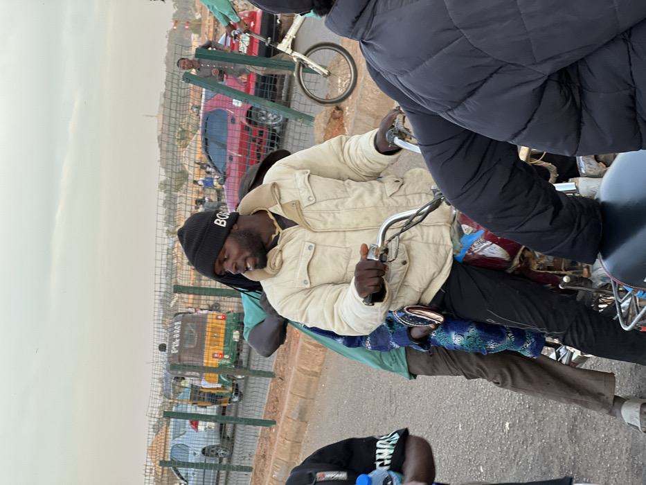 A man with a black beanie and tan jacket sits on a motorcycle. The man is also wearing black pants and white sneakers. Behind him are several vehicles. There is a red car and bicycle parked on a raised sidewalk section. A three-wheeled taxi is also visible behind a metal fence. A tall structure is visible in the far background.