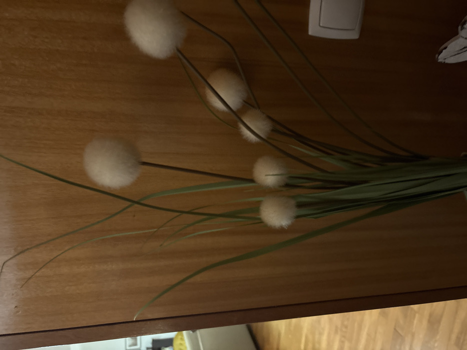A close-up shows fluffy, white, spherical accents amongst verdant, grass-like foliage. The composition is set on a wooden surface. A white, rectangular object sits to the upper-right of the image. The background reveals a glimpse of cream-colored walls and the edge of a wooden floor. The scene is lit with muted lighting.