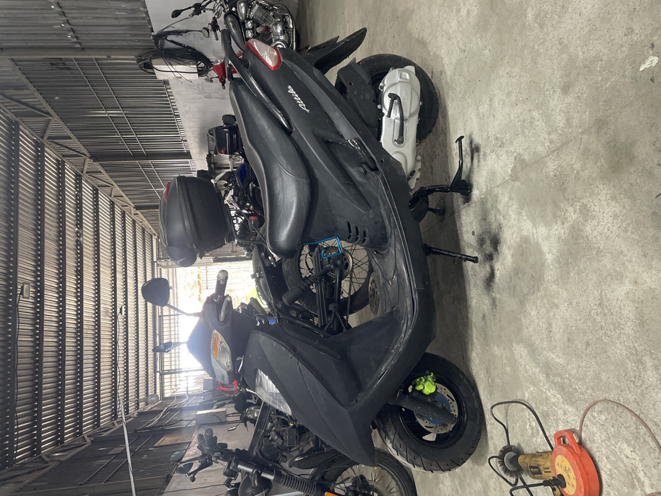 A dark-colored scooter with a storage box is parked indoors among other motorcycles. The scooter has a black seat, a white engine cover, and a green accent on the front wheel. It is standing on its kickstand. The building has corrugated metal walls and roof. A yellow and red power tool rests on the concrete floor nearby.