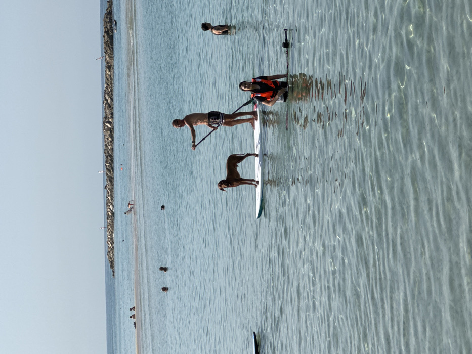 This image depicts a beach scene in Tel Aviv, Israel, characterized by calm, clear, light blue-green ocean water under a clear sky. In the foreground to mid-ground, a shirtless man wearing patterned swim shorts stands on a white paddleboard, holding a black paddle. A reddish-brown dog stands on the same paddleboard in front of the man, facing left. To the right of the paddleboard, a woman wearing a black top and an orange life vest is partially submerged in the water, with a paddle floating nearby. A portion of a second white paddleboard is visible to the far left. Several individuals are present in the mid-ground water, some standing, and others visible on a distant sandbar. A stone breakwater, extending horizontally across the background with small white and red markers, defines the calm water area.