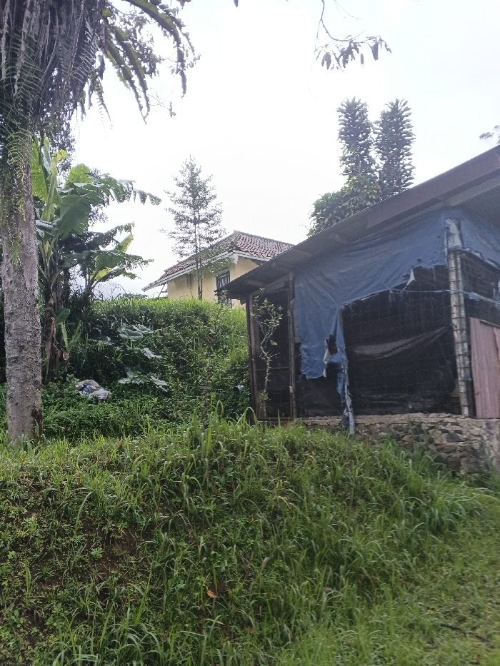 The image displays an outdoor scene in Unknown, Nepal, under an overcast sky. The foreground features an upward-sloping area covered primarily with green grass and weeds, interspersed with patches of exposed soil. To the left in the midground, a thick tree trunk with hanging fern-like fronds is visible, along with broad-leafed banana plants and dense green undergrowth. To the right, a makeshift structure, approximately two stories high, is present. This structure has a corrugated metal roof and its walls are largely covered by torn blue and black tarpaulins. It rests on a low stone foundation. A bare, multi-branched stick leans against the left side of this structure. In the background, beyond the vegetation and makeshift building, a permanent cream-colored building with a reddish-brown tiled roof and dark-framed windows is partially visible. Several tall, slender trees, resembling conifers, are dispersed throughout the background. No individuals, animals, or active events are present in the scene.