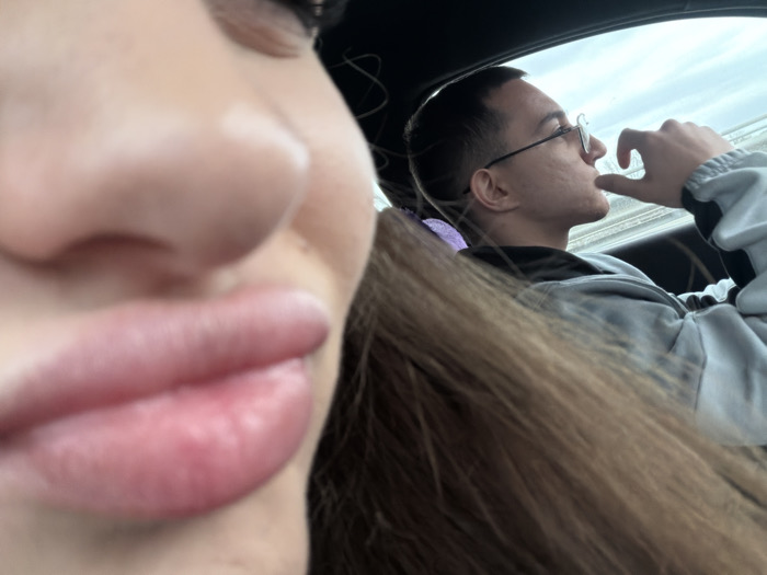 The image depicts two individuals inside a vehicle, located in Plovdiv, Bulgaria. In the extreme foreground on the left, a portion of a person's face is visible, including a blurred nose and full, pinkish lips, indicating a close-up perspective, possibly from a selfie. Long, brown hair trails from this individual into the lower right portion of the frame. In the midground, to the right and slightly behind the foreground subject, a male is seen in profile, looking towards the right (out of a vehicle window). He has short, dark hair and wears eyeglasses. His right hand is raised, with fingers positioned near his chin or mouth. He is wearing a light-colored, hooded garment, possibly a tracksuit top, with a darker collar visible underneath. The background through the vehicle window shows a blurred, light-colored horizon, suggesting an exterior landscape or road under an overcast sky. The dark interior roof of the vehicle is visible above the subjects. The male in the midground appears to be in the driver's seat, suggesting the foreground subject is the passenger.