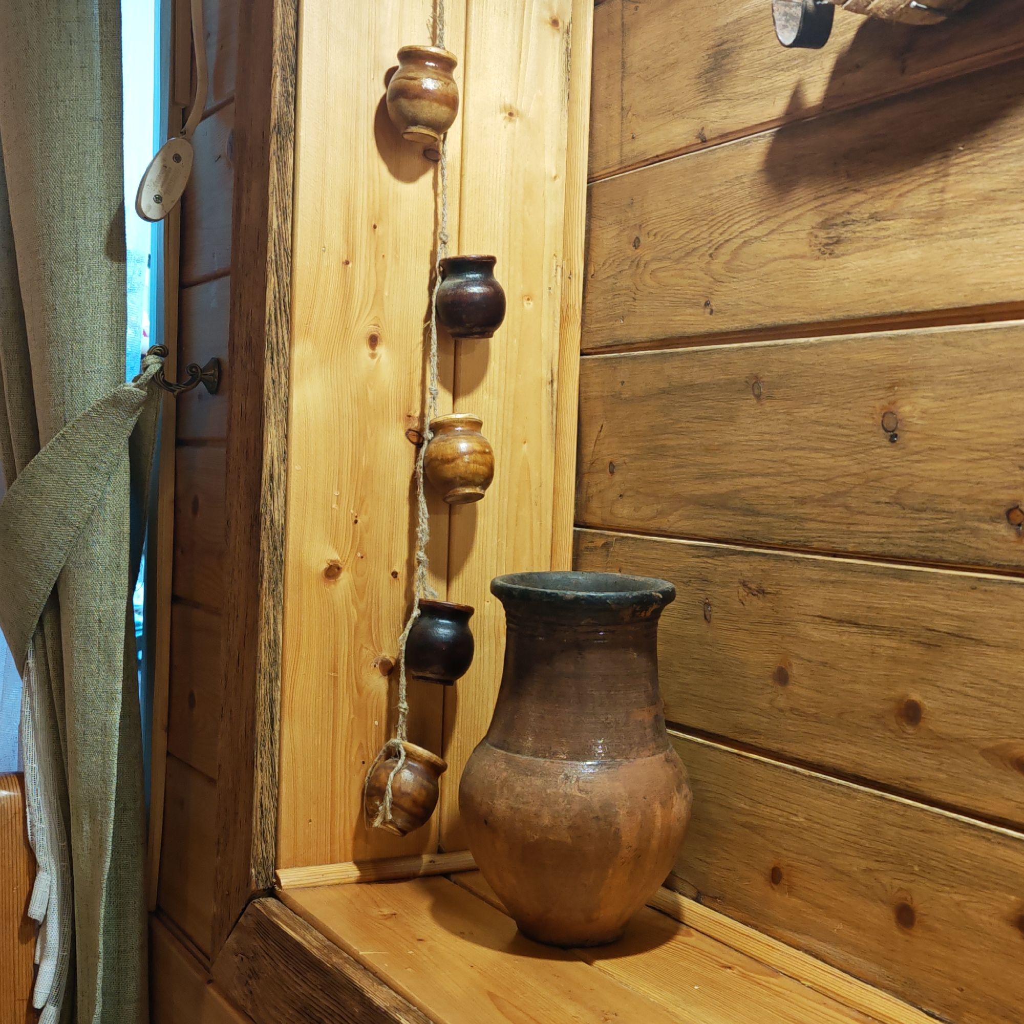 A close-up shot of rustic interior decor, possibly within a log cabin or similarly themed space. The walls and shelving are constructed from light-toned wood planks. On the right, the planks run horizontally. The main focus is a large, earthy-toned clay pot, its dark rim contrasting with the lighter body. To the left, smaller ceramic pots hang from a piece of twine affixed to a vertical wooden panel. A portion of a curtain and a wooden kitchen spoon are visible on the left side of the image, adding a touch of domestic familiarity. The presence of these specific objects suggests the location could be in Novo-Nikol'skoe, Russia, where such rustic and traditional interiors might be found, though without additional information, this remains speculative.