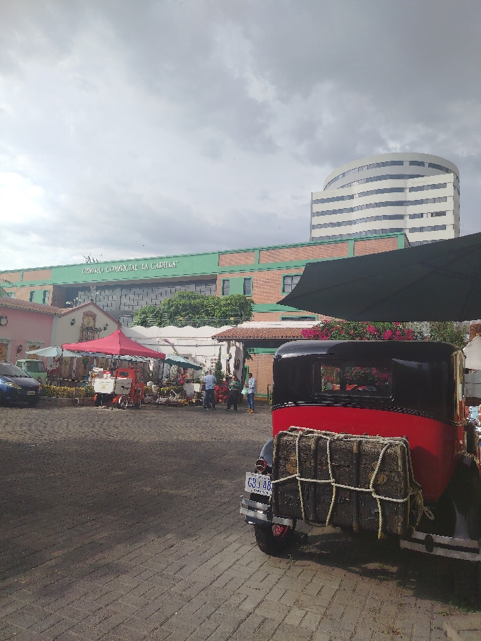 An overcast day illuminates a cobblestone square where a red and black vintage car, adorned with a large, tied-down trunk, stands prominently. In the background, vendors operate under tents, with shoppers milling about. Behind them, a long, green-roofed building labeled "CENTRO COMERCIAL LA CAPILLA" stretches across the scene, and a modern, cylindrical high-rise looms in the distance, under a cloudy sky.