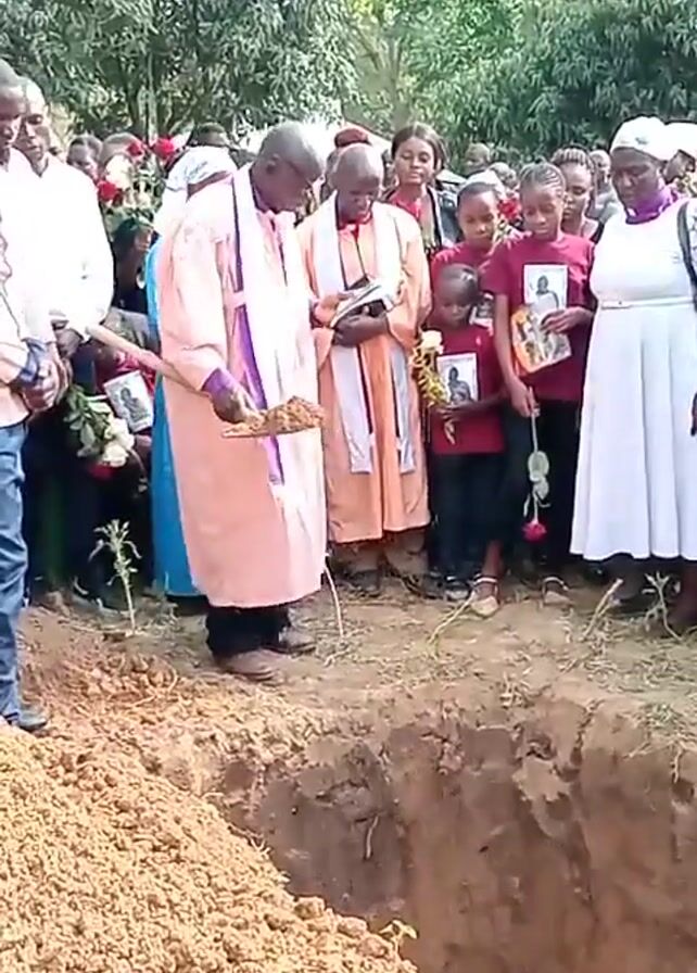 funeral ceremony. A group of people, including a man in religious attire, are gathered around an open grave. The man is dropping dirt into the grave with a shovel. Some of the people, particularly children, are holding photographs of the deceased and roses. The environment appears to be an outdoor area, possibly a cemetery or garden, with trees visible in the background.