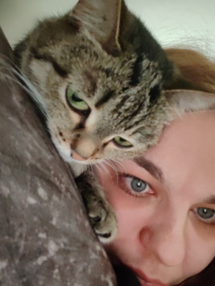 - "The image displays a close-up, angled view of a tabby cat resting adjacent to a human individual, located in Chaikovsky, Russia" by FM-IN9VB2, licensed under CC BY 4.0