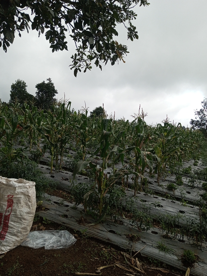 The image displays an agricultural field in Kondha, India, under an overcast sky. In the lower-left foreground, a white woven polypropylene sack with red markings stands upright on dark brown soil, accompanied by a crumpled clear plastic bag resting on the ground. The field extends into the midground and background, featuring rows of tall corn (maize) plants, many exhibiting tassels, intercropped with smaller, leafy plants, consistent with chili peppers or similar vegetables. The soil between these crop rows is covered by light grey plastic mulch sheeting. A dense treeline with dark green foliage borders the field in the background. Dark green leaves from an unseen tree partially obscure the top of the frame. No individuals are present within the depicted scene.