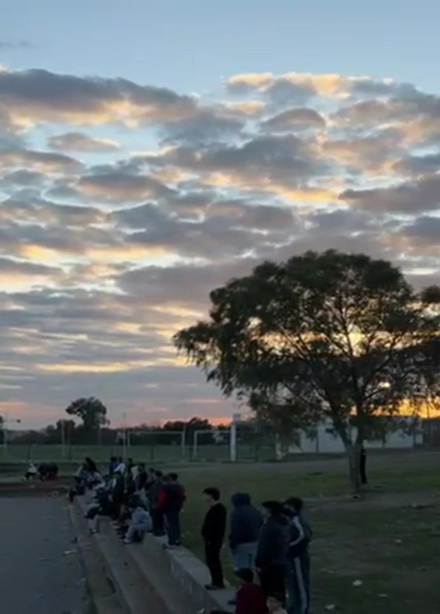 soccer field with a group of people standing on a low wall overlooking the field. A player in a neon yellow jersey is visible on the field. The sky is filled with a mix of gray and white clouds, with patches of orange and yellow light visible near the horizon, indicating either sunrise or sunset. A silhouetted tree stands near the edge of the field, its branches partially obscuring the sky. The scene suggests an outdoor gathering, possibly watching a soccer practice or game.