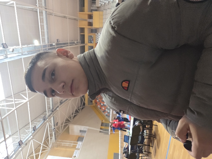 The image displays the interior of an indoor sports complex in Panagyurishte, Bulgaria. A young male, facing forward with a neutral expression, occupies the majority of the foreground. He possesses short, dark hair and is wearing a dark grey puffer jacket featuring an Ellesse logo on the left chest. His right hand is visible in the lower left, holding a small, dark, cylindrical object. In the mid-ground, a wooden sports floor extends towards a white table. Several dark chairs are arranged around the table, which holds a laptop and other miscellaneous items. Beyond the table, two individuals are visible on the floor, one wearing a red uniform and another a blue uniform, appearing to be engaged in an activity. The background features rows of orange stadium seating and yellow architectural elements. The ceiling reveals exposed white metal trusses, lighting fixtures, and ductwork. The environment is uniformly illuminated by artificial light.