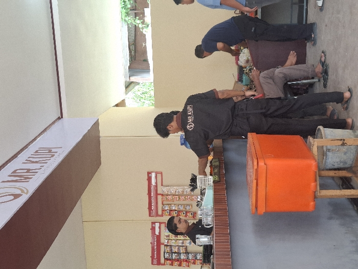 A man wearing a black shirt that says "MR. KUPI" is standing behind a counter with snacks on shelves behind him. An orange cooler sits next to him on a wooden structure with a metal bucket. Two men are sitting in chairs while another man is bent over, looking at something. There is a sign that says "MR. KUPI" on the left side of the image.