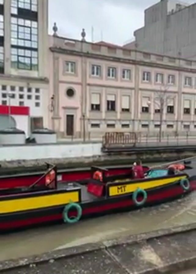 colorful tour boat in a canal in an urban setting. The boat is long and narrow, with red and yellow paint and green life preservers along the sides. It has "MT" painted on its bow. There are several people on board, wearing red jackets. The canal is lined with buildings on both sides, including a Santander bank branch. The sky is overcast. The camera follows the boat as it moves along the canal.