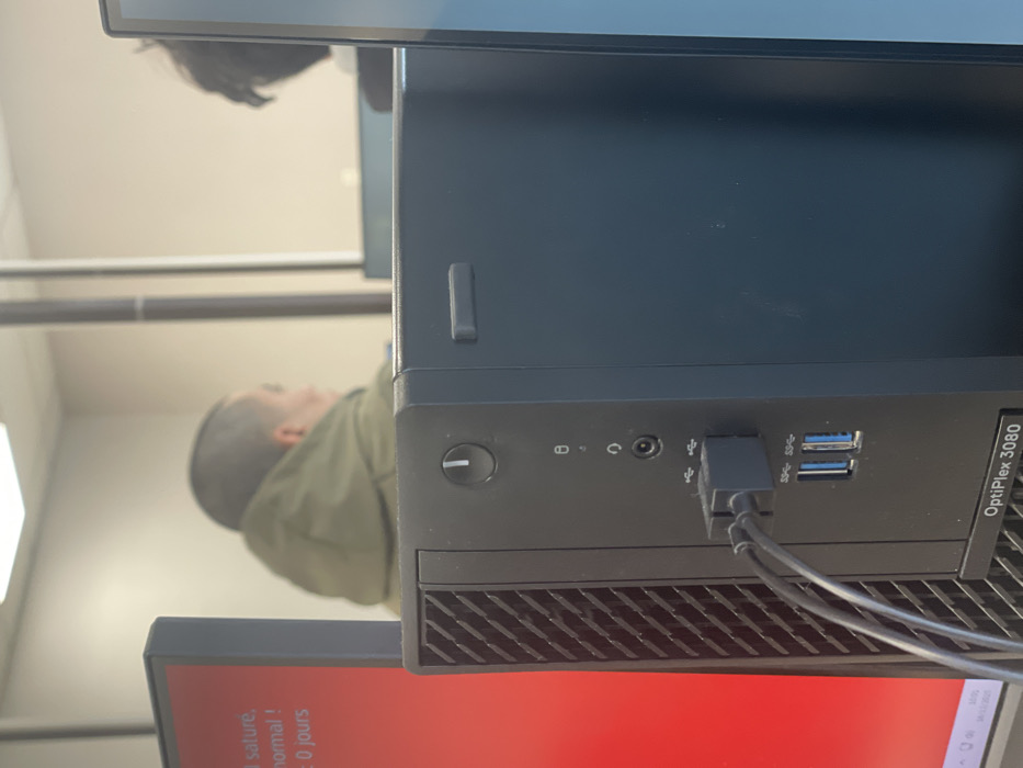 The scene depicts an interior computer workstation environment in Hérouville-Saint-Clair, France. In the immediate foreground, a black Dell OptiPlex 3080 desktop computer tower is prominently featured, displaying its front-right side. The tower's front panel includes a circular power button with a white indicator, a security lock icon, a 3.5mm headphone jack, a standard USB Type-A port, and two blue USB 3.0 (SuperSpeed) ports. Two black USB cables are connected to the standard USB port via a black adapter. A vertical ventilation grille is visible on the left side of the tower's front face. To the left of the computer tower, a monitor screen displays red text on a dark background, which includes "saturé," "normal!", and "0 jours." To the right of the tower, a partial view of another monitor shows a light blue screen. In the blurred midground, a person with a shaved head, wearing an olive-green hooded jacket, is seated facing right. A second, obscured individual with dark hair is visible to the far right. The background consists of a plain, light-colored wall and overhead fluorescent lighting.
