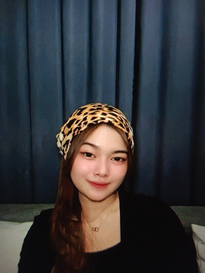 A young female subject is depicted from the chest up, centrally framed against a background of dark blue, vertically pleated curtains. The subject has light skin, dark eyes, and long brown hair. She wears a leopard print headscarf covering the top of her head, with a section of her hair visible over her left shoulder. Her attire consists of a black top or dress with a square neckline, accessorized with a gold-colored necklace featuring two interlocking oval pendants. She exhibits a subtle smile, looking directly into the camera. The lower frame reveals a textured grey and white surface, possibly upholstery, with a white pillow partially visible on the right. The scene is situated in the city of Bekasi, Indonesia.