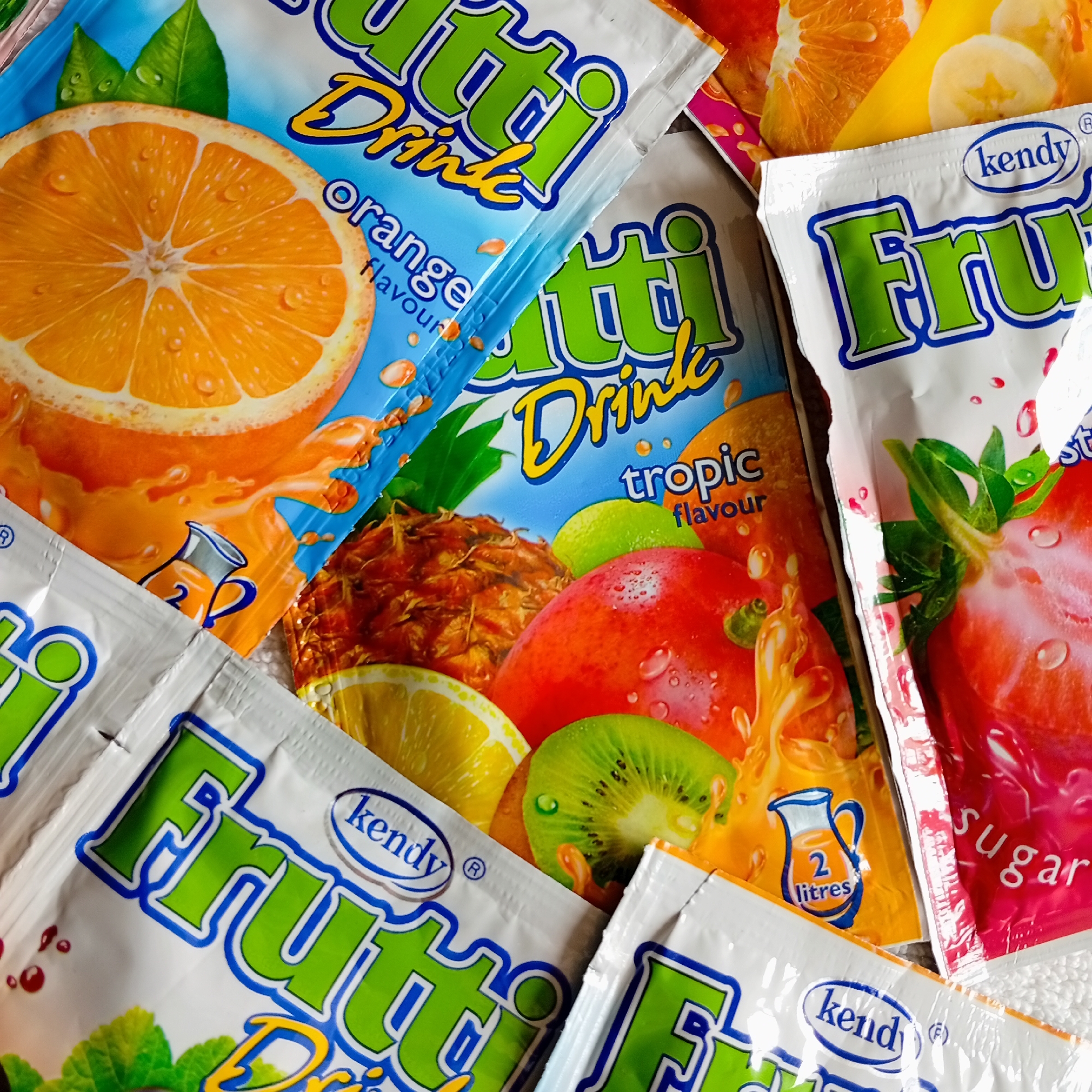 - "The image displays a close-up, top-down view of several brightly colored "Frutti Drink" powdered beverage sachets, manufactured by Kendy, arranged on a surface in Harmanli, Bulgaria" by FM-tIMEp2, licensed under CC BY 4.0