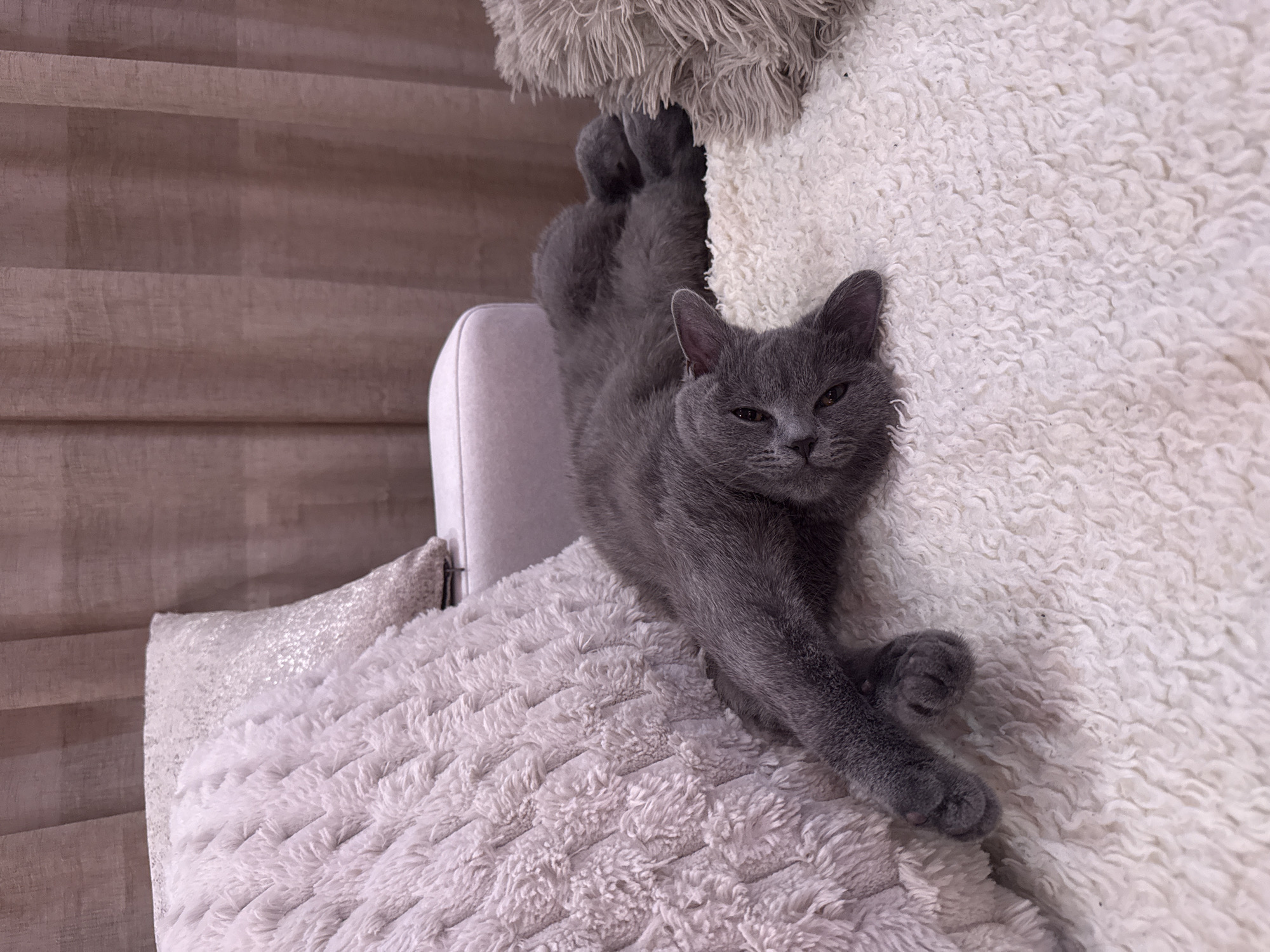 A grey cat is lying on a white, textured pillow, with its head resting on a fuzzy, off-white surface. The cat's body is stretched out, with its hind legs extended upwards and its front paws crossed. A section of a light grey chair is visible behind the pillow. The background features a textured, brown wall or window covering. The image does not show enough information to identify the location.