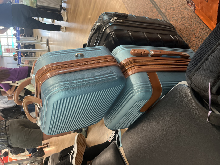 The image depicts an indoor airport terminal environment in Guarulhos, Brazil. In the immediate foreground, a stack of two light blue, hard-shell suitcases with horizontal ridged textures and prominent brown trim, zippers, and handles is centrally positioned. Keys are attached to the upper handle of the top suitcase. To the right of these, a black hard-shell suitcase with vertical ridging is partially visible. In the lower left quadrant, a dark upholstered seat is present, and a person's left foot, adorned in a black Vans Old Skool sneaker with white laces and sole, rests near it. A black backpack with a purple elastic band is partially visible in the lower center. In the midground, several individuals are present. One person on the left wears olive green shorts and a plaid shirt, standing with dark footwear. Another individual is seen from behind, wearing dark pants and white athletic shoes, standing next to a silver-colored rolling suitcase on the far right. Further back, a person in a purple shirt is partially visible. The floor is composed of light-toned, possibly laminate or wood flooring, transitioning to reddish-brown tiles on the right. Stanchions with blue ropes are visible in the background, suggesting a queue or designated area. Overhead lighting illuminates the scene. People appear to be standing or waiting in what seems to be a general airport concourse or check-in area.