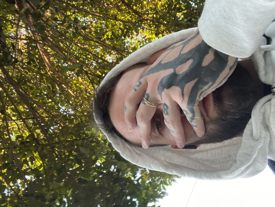 A low-angle close-up photograph captures a male individual outdoors in Cordoba, Argentina. The subject is partially obscured by their left hand, which is raised, covering the upper portion of the face, including the eyes and nose. The subject wears a light-colored, possibly white, hooded sweatshirt with the hood pulled up. Dark, abstract, organic-shaped tattoos cover the back of the left hand and fingers, and a plain gold-colored band ring is visible on the left ring finger. A dark wireless earbud is present in the subject's right ear. The subject has dark hair and a beard. The background consists of a dense canopy of green tree leaves and branches, illuminated by sunlight filtering through, creating a dappled light effect. A bright, clear sky is visible in the upper left corner. The specific location within Cordoba, Argentina, is not visually identifiable beyond an outdoor, treed environment.