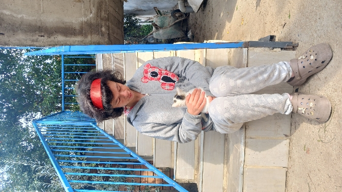 A young individual with dark, curly hair and a red headband is seated on the second step of a concrete outdoor staircase in Menderes, Turkey. They are wearing a grey zip-up hooded sweatshirt featuring a red and black plaid teddy bear patch on the left chest, light grey patterned sweatpants, and light brown clog-style shoes with decorative cutouts. The individual holds a small white and black patterned kitten with both hands, looking down at it. To the left, a blue metal railing ascends alongside the stairs, with green foliage visible beyond it. To the right, a weathered concrete support column is present, and on the ground level, a green wheelbarrow and some pipes are partially visible against a light-colored wall or structure. The ground in the foreground is rough concrete or dirt. The scene is illuminated by natural light, suggesting an outdoor daytime setting.