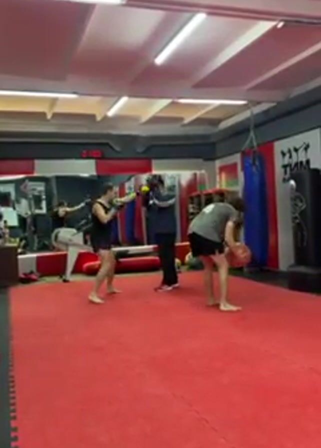 Three people are visible in a gym setting with a red mat floor. The gym is equipped with workout equipment and punching bags. One individual wearing a black tank top and shorts is practicing punches with an instructor who is holding padded mitts. Another person, wearing a grey shirt and black shorts, is off to the side holding a ball. The instructor is wearing a navy jacket and black pants. There is a wall mirror reflecting the training session. The gym features a clock on the wall and signage with lettering.